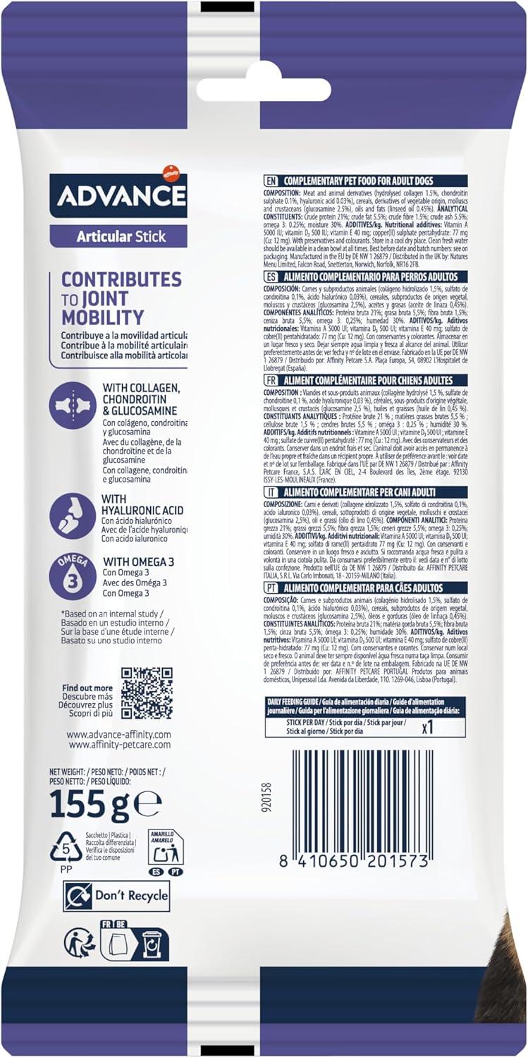 Advance Articular Sticks contribuye a la movilidad de tu perro con resultados visibles en 6 semanas, Su fórmula científicamente probada contiene colágeno, condroitina y glucosamina, ácido hialuronico y omega 3.