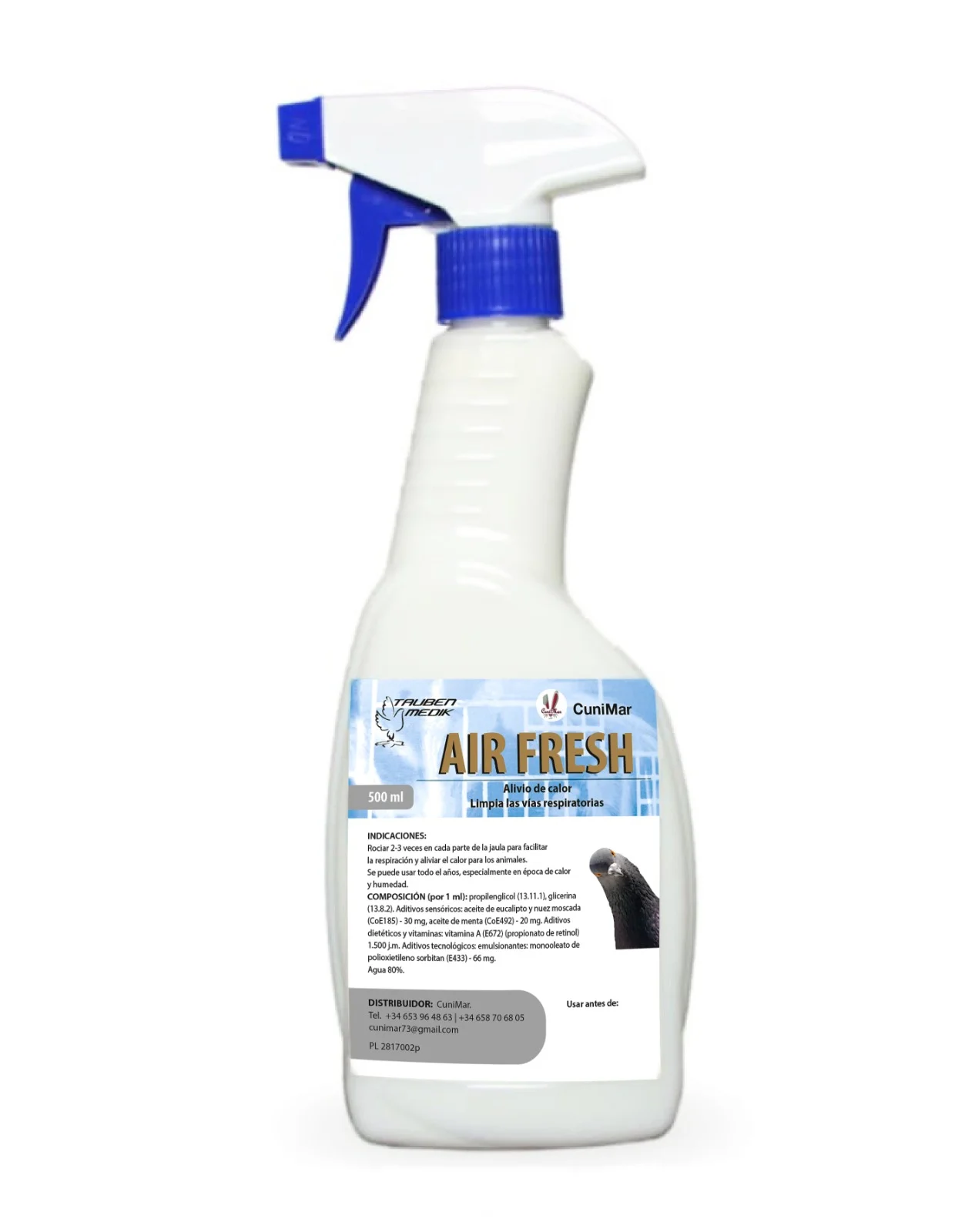Air Fresh mantiene en perfecto estado el sistema respiratorio de las palomas (aumenta la resistencia a todo tipo de infecciones respiratorias). Se utiliza para purificar y desinfectar el aire del palomar.