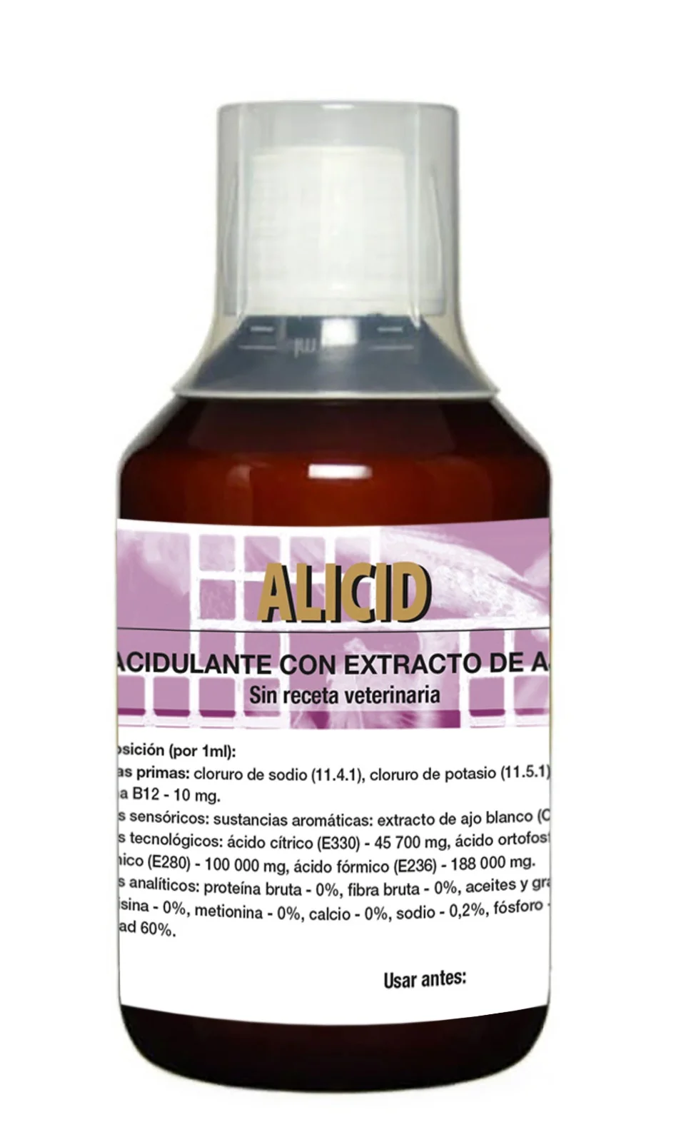Alicid es una combinación única de extracto de ajo y ácidos orgánicos. Las sustancias activas contenidas en el extracto de ajo (alicina, ajoeno) mejoran el apetito y apoyan los procesos digestivos. Los ácidos orgánicos promueven el desarrollo de la microflora natural, ayudando así a mantener la homeostasis del sistema digestivo.