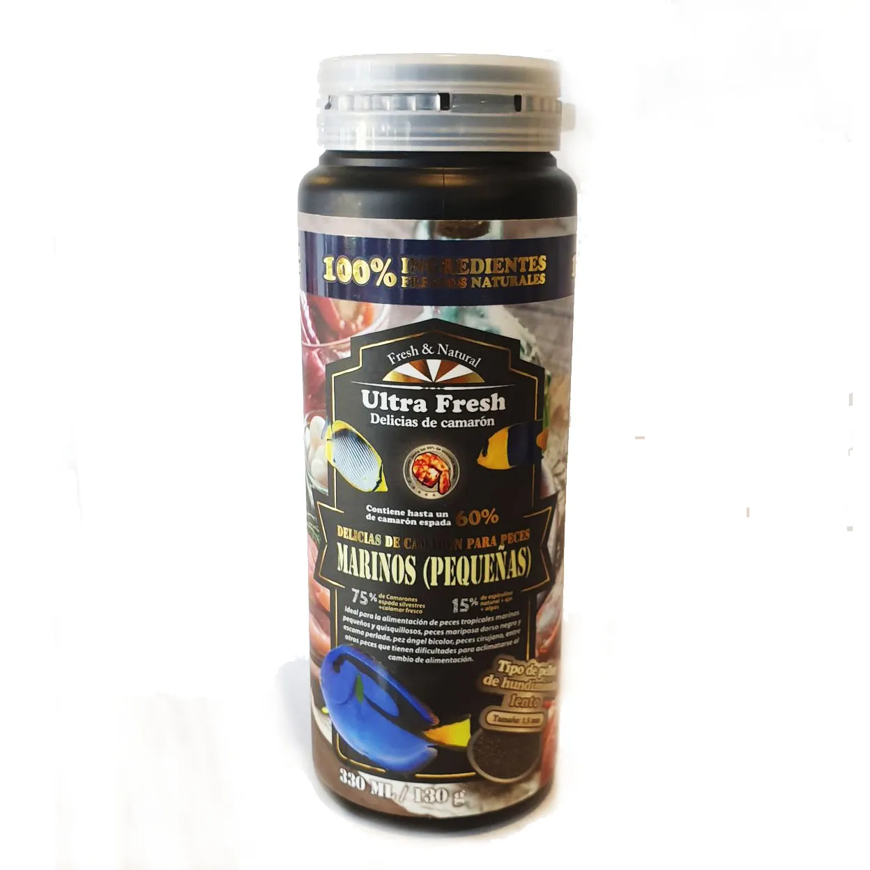 Repleto de un alto contenido de langostinos espada silvestres (hasta un 60%), calamar fresco, camarones Jingou, ajo fresco, espirulina natural, algas marinas, además de una mezcla de ingredientes naturales cuidadosamente seleccionados, esta formulación no contiene atrayentes ni aditivos. Proteínas 100% naturales procedentes de carnes frescas, verduras y algas. Su excelente palatabilidad y sus ricos valores nutricionales son perfectos para todo tipo de peces tropicales de agua salada grandes y delicados que tienen dificultades para aclimatarse a los alimentos.