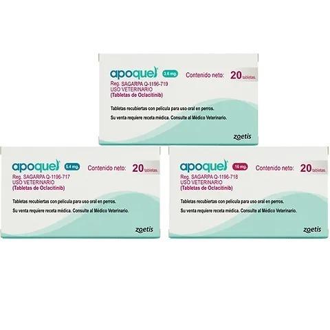 Apoquel es un medicamento que se presenta en forma de comprimidos que tienen diferentes concentraciones de oclacitinib, su componente activo principal. Esta sustancia está catalogada como un inhibidor de la Janus Quinasa (JAK), una serie de proteínas, cuyas enzimas participan en la respuesta alérgica de los canes. Este comprimido es también conocido como Apoquel genérico, puesto que es un medicamento que se distingue por su formulación y no por la marca del producto en sí. Todo ello, debido a que se trata de un tratamiento innovador para contrarrestar los efectos negativos de la dermatitis alérgica y atópica en perros.