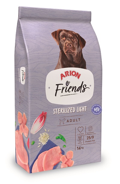 Arion Friends Sterilized Light 25/9 es un alimento completo para perros esterilizados o con tendencia al sobrepeso. Su fórmula baja en grasas y con proteínas de alta calidad favorece el control efectivo del sobrepeso y un estado corporal óptimo. La incorporación de condroprotectores protege sus articulaciones y la L-carnitina favorece el tono muscular contribuyendo a quemar mejor la grasa subcutánea. Incorpora altos niveles de fibras vegetales para incrementar la sensación de saciedad y plenitud gástrica y disminuir la ingesta en perros de apetito incontrolado.