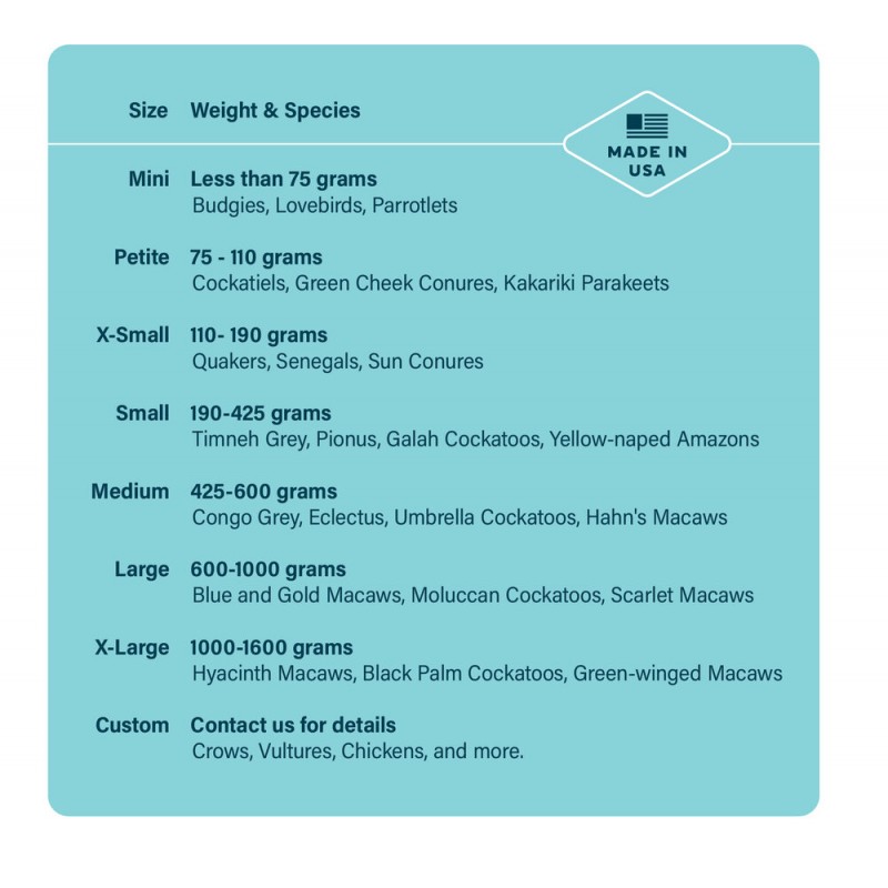 Small: 190-425 grs. Pionus, pequeñas cacatúas, pequeños amazonas…
