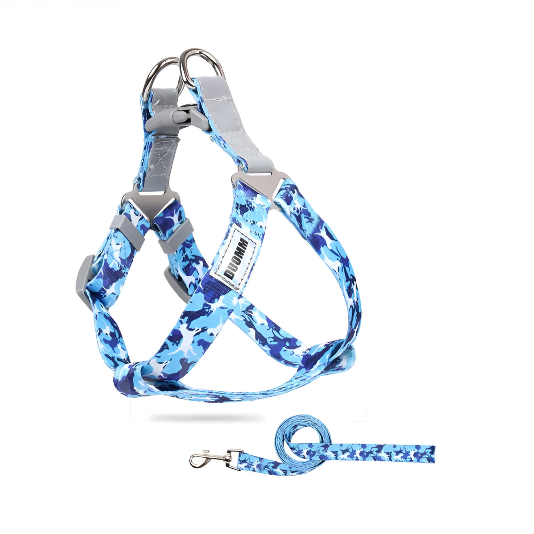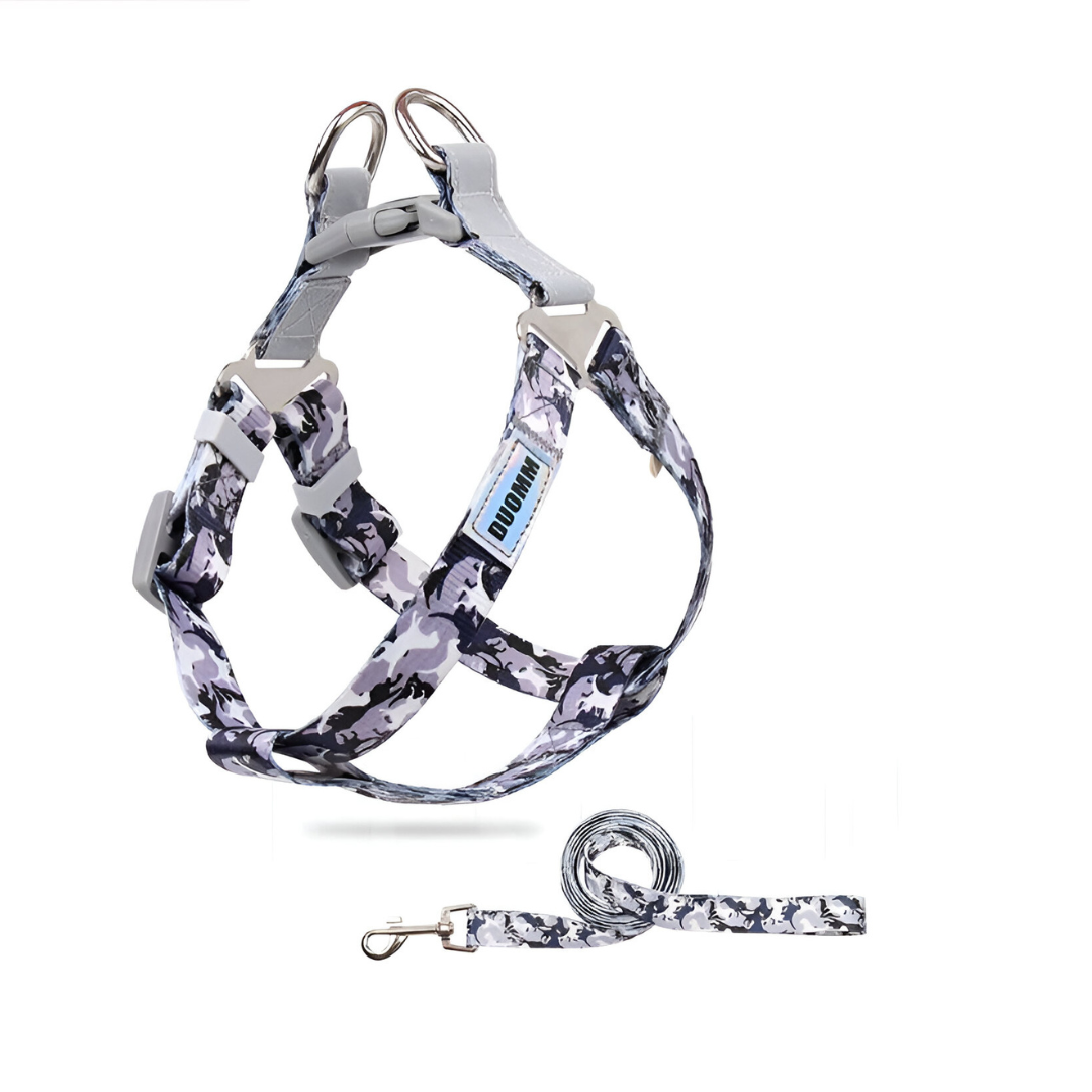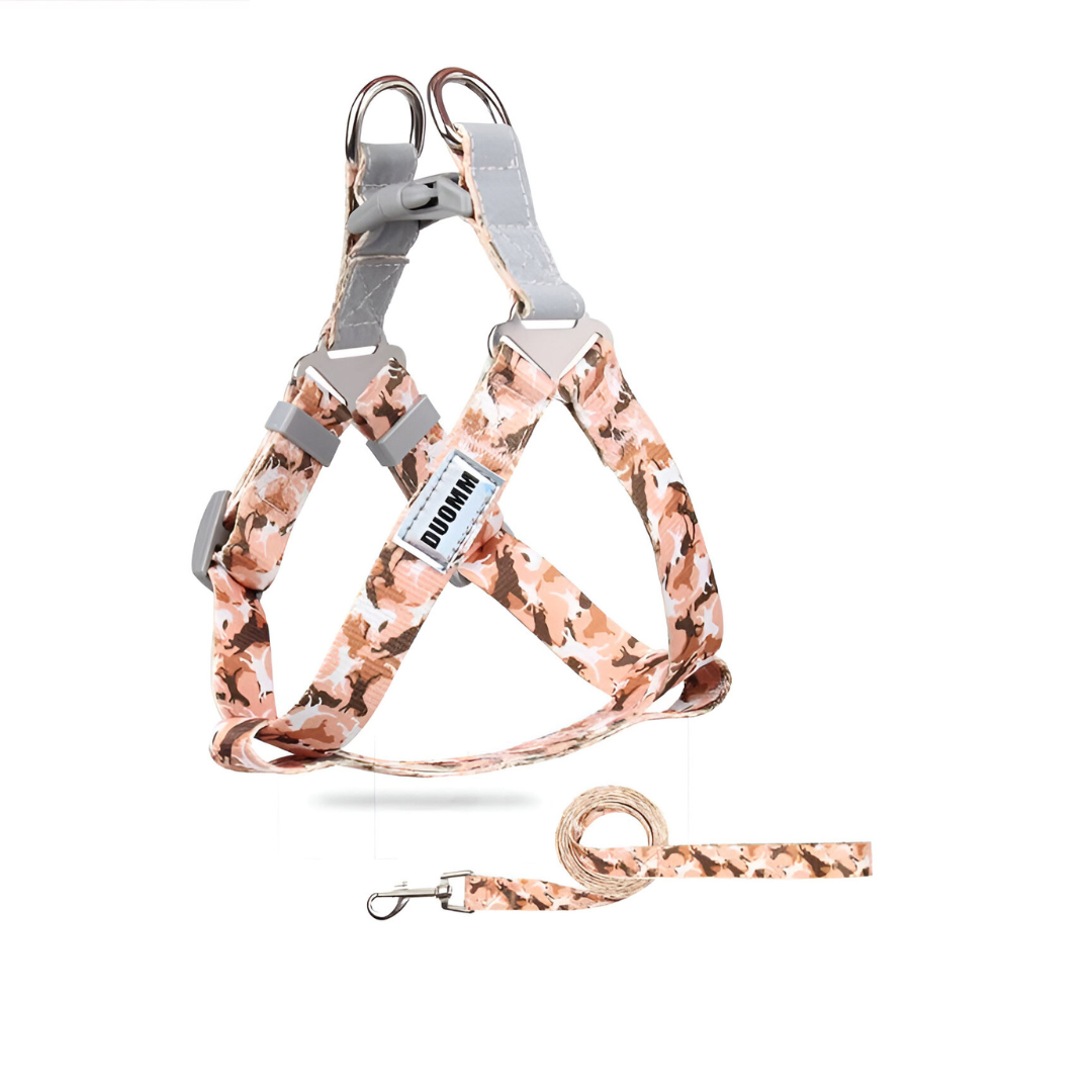 Este arnés con correa está hecho de cinta resistente con un diseño estampado. Ofrece un ajuste cómodo y seguro para paseos diarios con tu mascota. Disponible en varios colores, talle L de 10 a 15kg