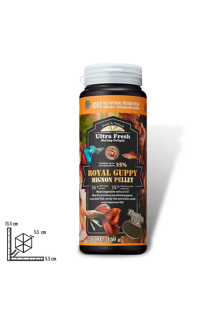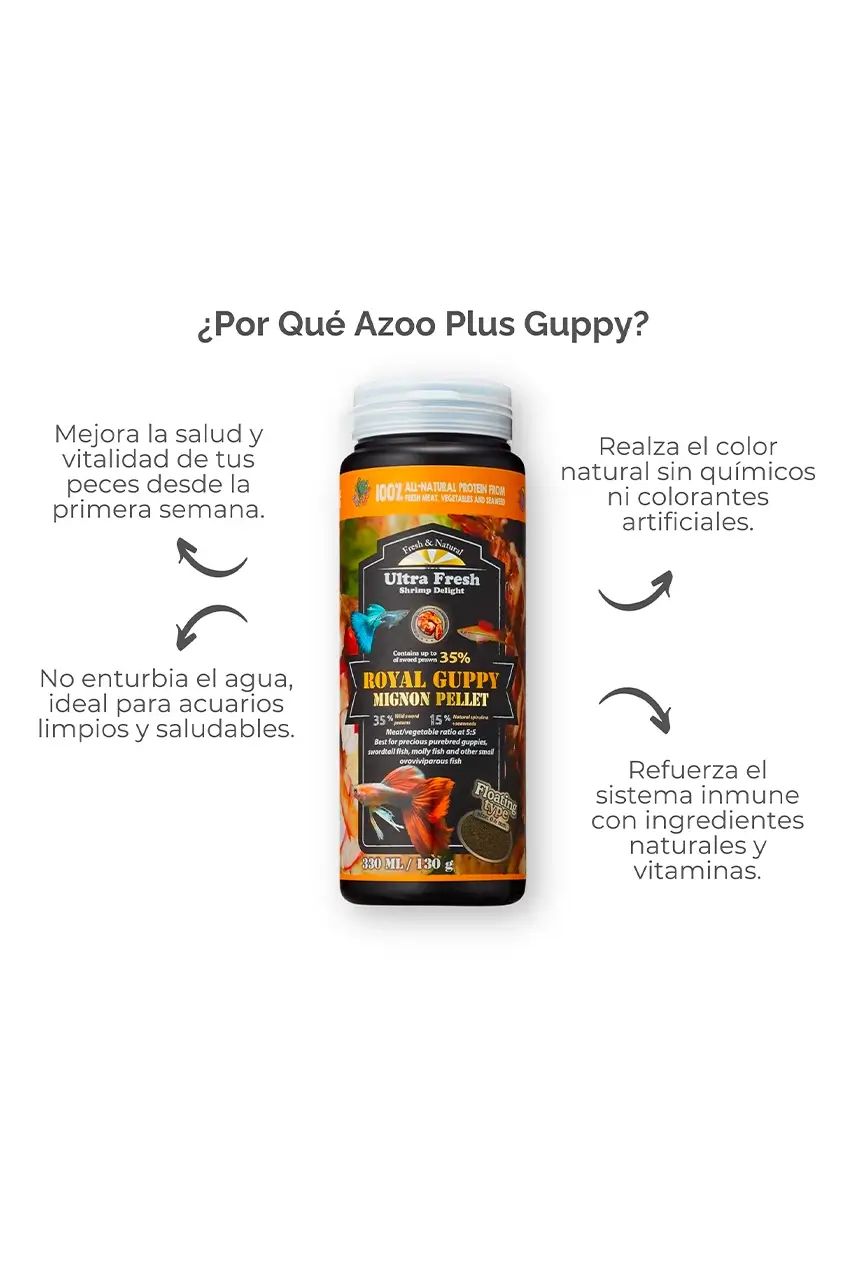 Nutrición Natural para Guppies Premium Alimento natural para guppies y vivíparos. Mejora su salud, color y mantiene el agua limpia.