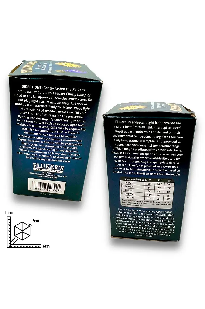 Las bombillas incandescentes de Fluker proporcionan el calor radiante (luz infrarroja) que los reptiles necesitan para regular su temperatura corporal. Los reptiles, siendo ectotérmicos, dependen de la temperatura ambiental para esta regulación. Un ETR (Rango de Temperatura Ambiental) inadecuado puede predisponer a los reptiles a infecciones crónicas. Fluker facilita la selección de la bombilla adecuada con una tabla de referencia fácil de leer, que ayuda a elegir la bombilla correcta en función de la distancia entre la bombilla y el reptil.