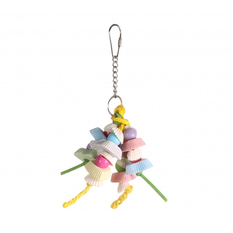 Práctico juguete fabricado con multitud de piezas de calcio, conchas naturales y bolitas de plástico para aves de pequeño tamaño como periquitos, phyrruras, agapornis, etc.