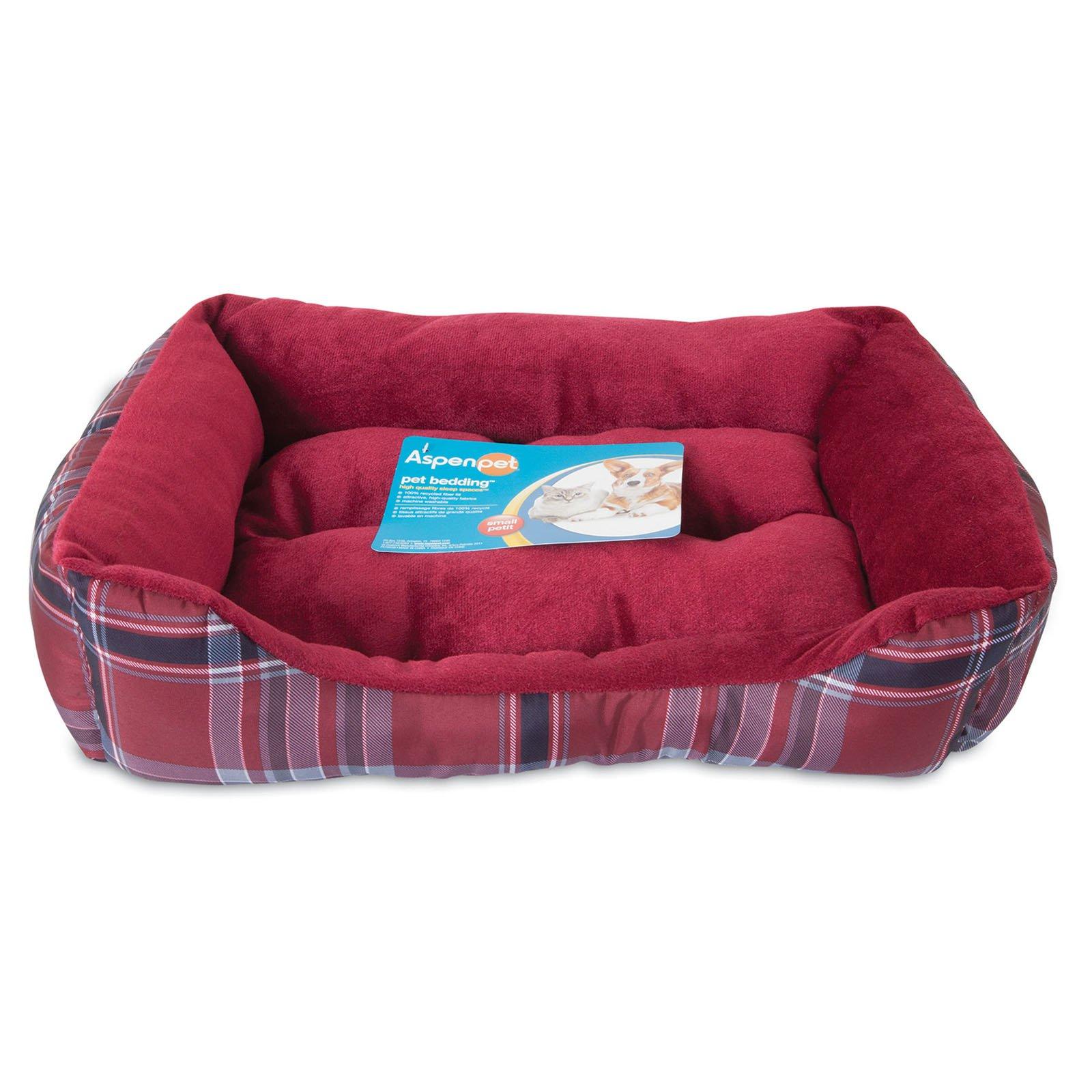 Cama rectangular de 20” de largo y 15” de ancho, con tela a cuadros por fuera.