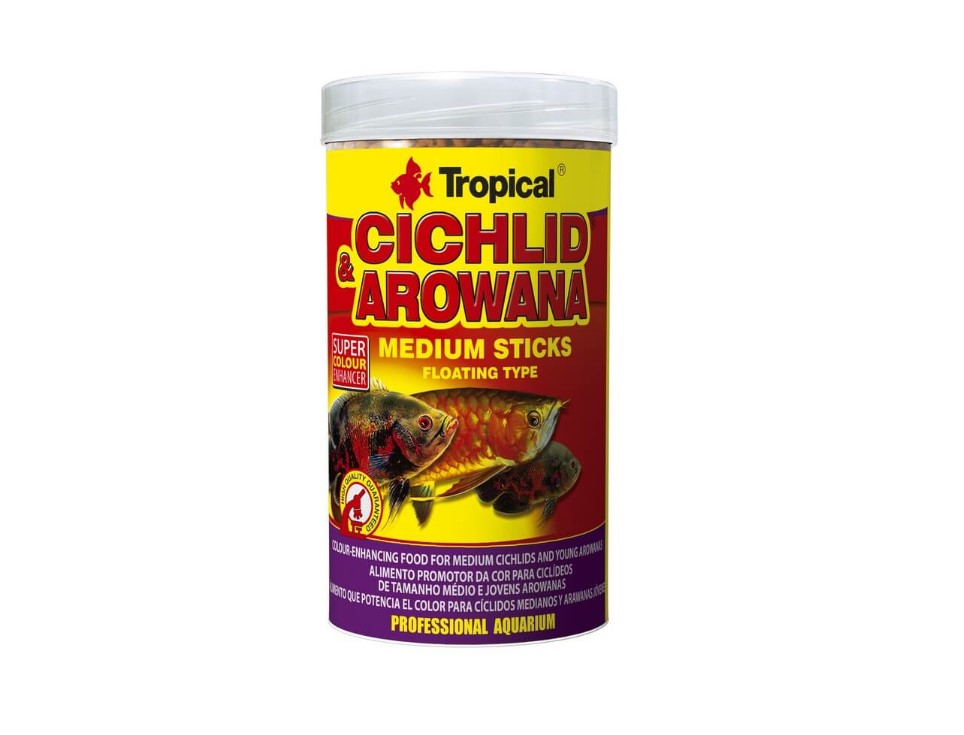 CICHLID & AROWANA MEDIUM STICKS TROPICAL un alimento en sticks, resaltador del color con astaxantina para cíclidos medianos y arowanas jóvenes. Un alimento multicomplemental resaltador del color en forma de sticks flotantes, destinado para la alimentación diaria de cíclidos medianos y arowanas jóvenes y otros especies de peces omnívoros y carnívoros. Cichlid & Arowana Medium Sticks contiene un alto nivel de colorantes naturales, entre otros astaxantina de buena asimilación. Los colores de los peces alimentados regularmente con los sticks se intensifican y cogen reflejo. La proteína de fácil digestión y una serie de vitaminas y microelementos seleccionados de manera óptima favorece el crecimiento equilibrado y una condición perfecta de los peces. El sistema inmunológico queda activizado por vitamina C estabilizada y un inmunoestimulador fuerte – el beta glucano. Para variar la dieta de cíclidos medianos recomendamos también: Cichlid Spirulina Medium Sticks, Cichlid Red & Green Medium Sticks, Cichlid Gran.