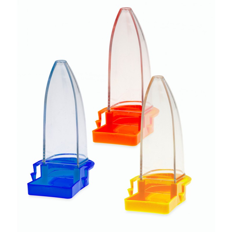 Este dispensador de agua o alimento está fabricado en plástico de llamativos colores y tiene una capacidad de 110 ml, por lo que es ideal para pequeñas aves tipo canarios, forpus, agapornis…