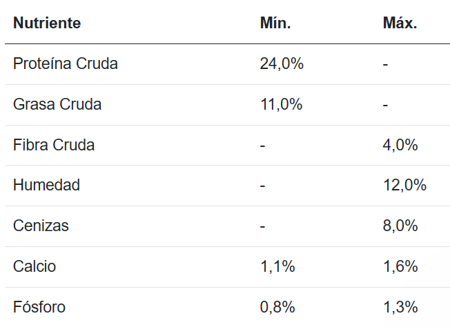 Harina de subproductos de pollo, maíz amarillo, arroz, trigo, gluten de maíz, harina de carne y hueso de res y/o cerdo, grasa animal (res y/o pollo y/o cerdo) estabilizada con antioxidantes BHA & BHT y/o TBHQ, harina de pescado, digesto animal (hidrolizado de hígado de pollo y/o cerdo), sal, fibra de soya, cloruro de potasio, inulina, L- lisina, cloruro de colina, zeolita, carbonato de calcio, ortofosfato de calcio, sulfato de zinc, sulfato ferroso, suplementos vitamínicos (A, D-3, E, B12), suplemento de riboflavina, niacina, pantotenato de calcio, sulfato de manganeso, mononitrato de tiamina, ácido fólico, sulfato de cobre, hidrocloruro de piridoxina, yodato de calcio, selenito de sodio.