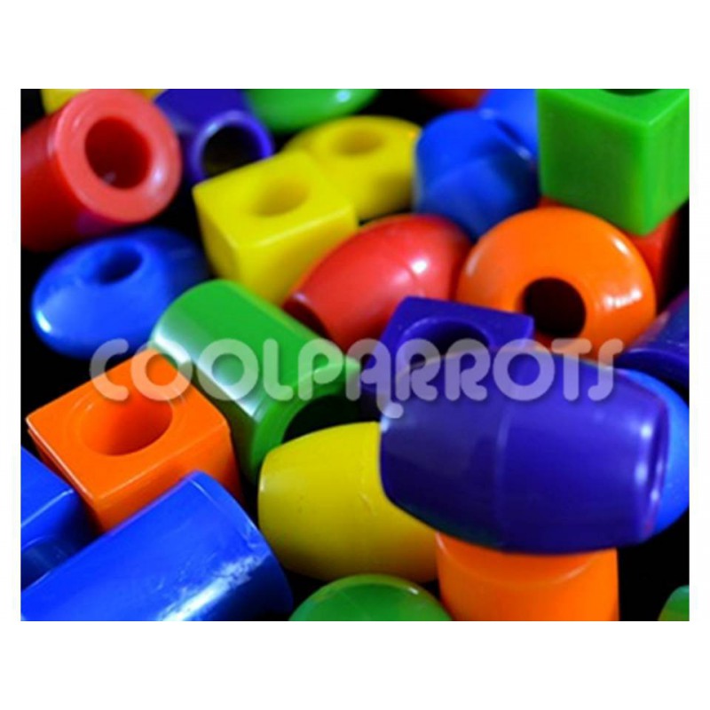 Pack de 10 cuentas acrílicas de diferentes formas y colores. Sus medidas oscilan entre 1,5 y 2,5 cm. Este tipo de piezas hacen el juguete bastante más duradero, son ideales para combinarlas con piezas de madera y otros materiales más fáciles de romper. Para aves de mediano/gran tamaño.