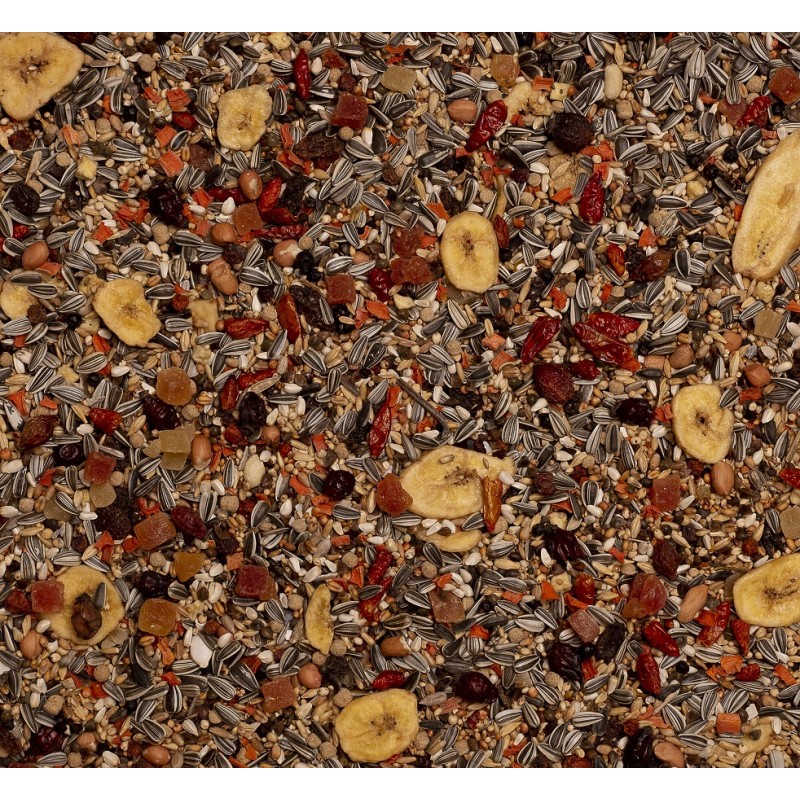 Composición: Cereales, semillas (1% de chía, 1% de quinoa), frutas (2% de pasas, 2% de plátano deshidratado, 1,7% de escaramujo deshidratado, 1,7% de bayas de enebro deshidratadas, 1,7% de bayas de serbal deshidratadas, 1,7% de piña deshidratada, 1,7% de papaya deshidratada, 0,8% de manzana deshidratada), verduras (2% de zanahoria deshidratada, 0,8% de guindillas), minerales (2% de arenilla de ave), frutos secos (2% de cacahuetes), derivados de origen vegetal, levaduras, aceites y grasas.