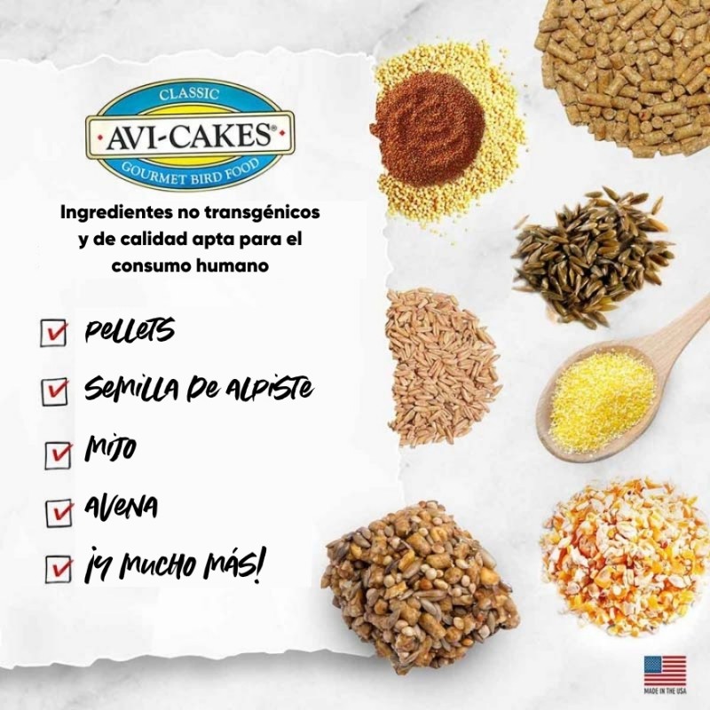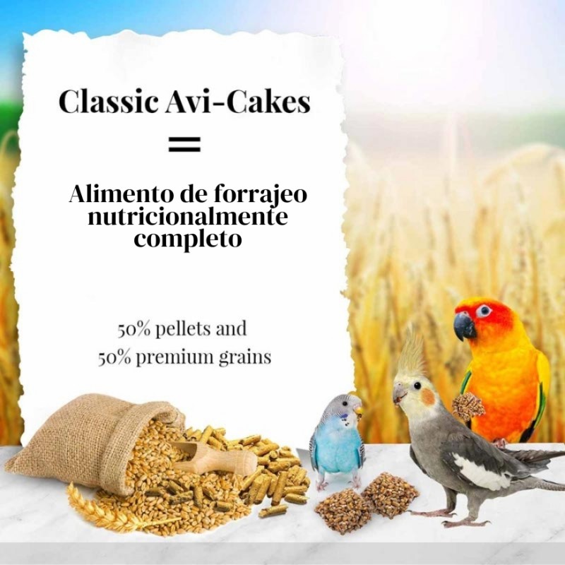 Guía de alimentación: Ofrece Avi-Cakes frescos a diario, junto con agua limpia y fresca. Suministra la cantidad que creas que tu ave comerá en un plazo de 12 horas. Se recomienda complementar la dieta con hasta un 20% de frutas y verduras frescas. También puede ofrecerse como premio o golosina.