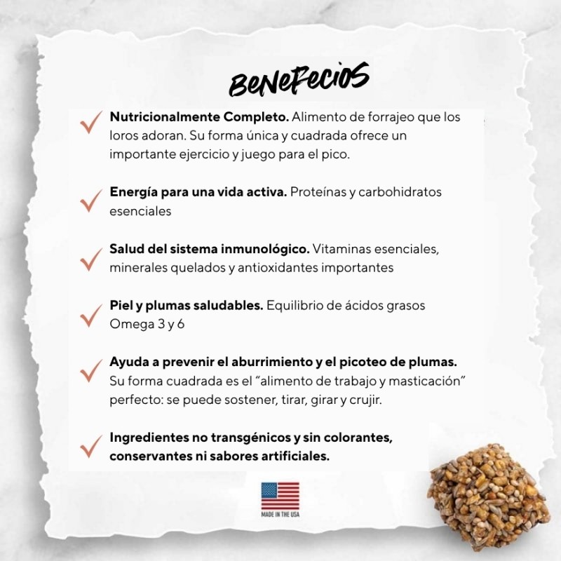 Cada bocado contiene una mezcla equilibrada de proteínas, carbohidratos, ácidos grasos omega 3 y 6, y vitaminas que favorecen una piel sana, un plumaje brillante y un sistema inmunológico fuerte. Esta golosina nutritiva no contiene colorantes, conservantes ni saborizantes artificiales, y está elaborada con ingredientes de calidad apta para el consumo humano.