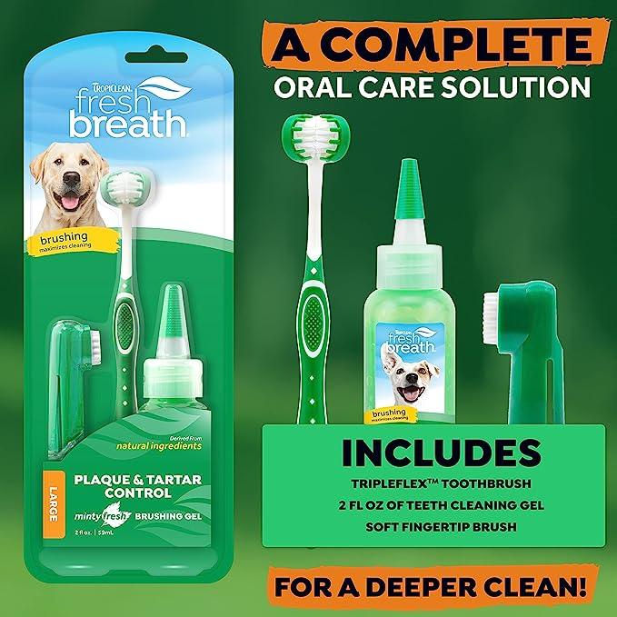 Nuestro Set de Cuidado Bucal Fresh Breath incluye nuestro cepillo de dientes TripleFlex, un Cepillo de Dedo y nuestro Gel de Cepillado para Perros. Nuestro Gel de Cepillado para Perros contiene una mezcla única de ingredientes que ayuda a eliminar la placa y el sarro y se adhiere a los dientes para una limpieza superior. Nuestro Cepillo de Dientes TripleFlex limpia 3 veces más rápido con sus cerdas suaves en 360 grados. También se incluye nuestro Cepillo de Dedo que te permite limpiar suavemente ayudando a remover la placa y el sarro. Dientes limpios, boca sana, perro feliz.