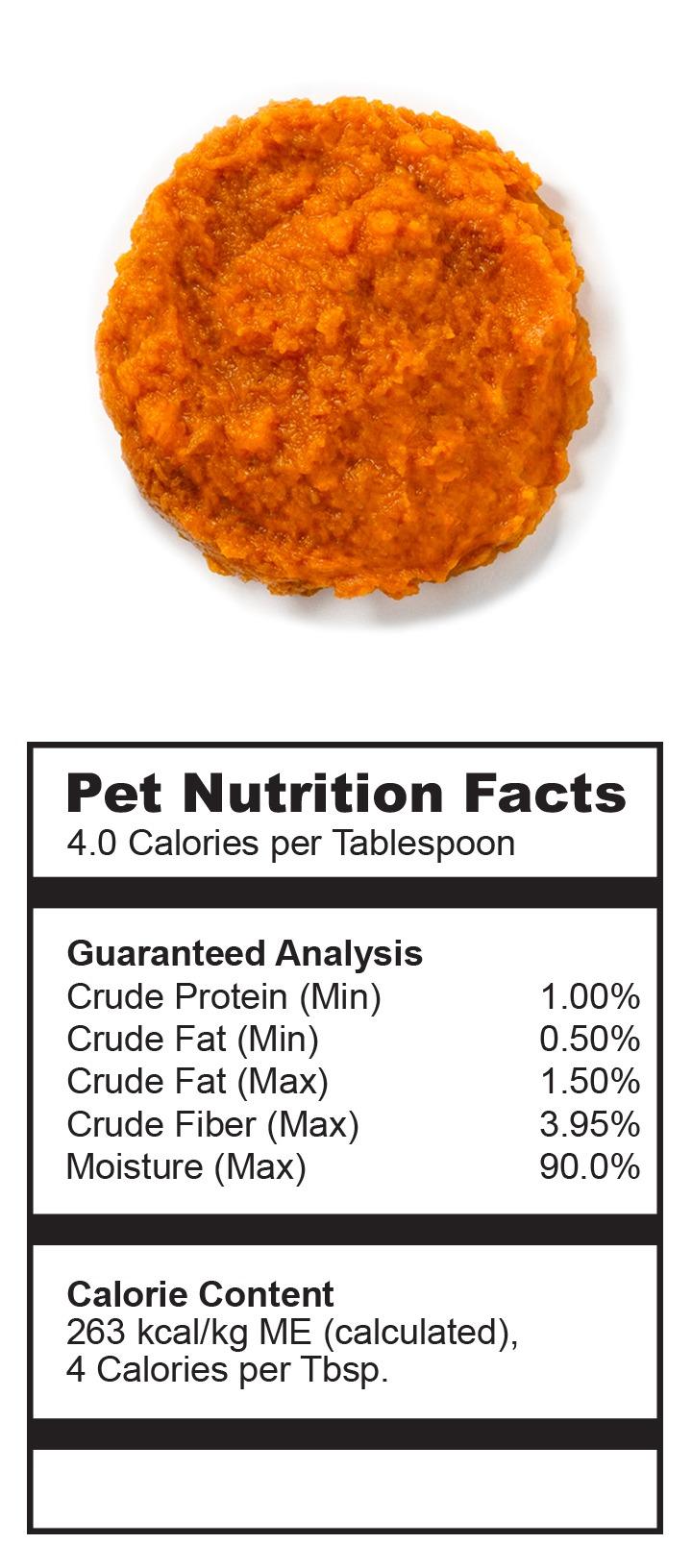 El malestar digestivo ocurre con frecuencia al cambiar de alimentos. La causa suele ser la introducción de nuevas proteínas y grasas que requieren que el sistema digestivo de su mascota se ajuste y se restablezca a esta nueva matriz alimentaria. Los signos de malestar digestivo incluyen calambres estomacales, indigestión, gases, diarrea, vómitos, regurgitación o negativa a comer. Nuestro suplemento digestivo de calabaza es un complemento ideal para la rutina diaria de su mascota. Es muy bajo en calorías y es una gran fuente de fibra dietética, por lo que es una excelente manera de apoyar la salud digestiva y un peso saludable. • Puede utilizarse en PERROS y GATOS. Calorías ultrabajas para el control de peso