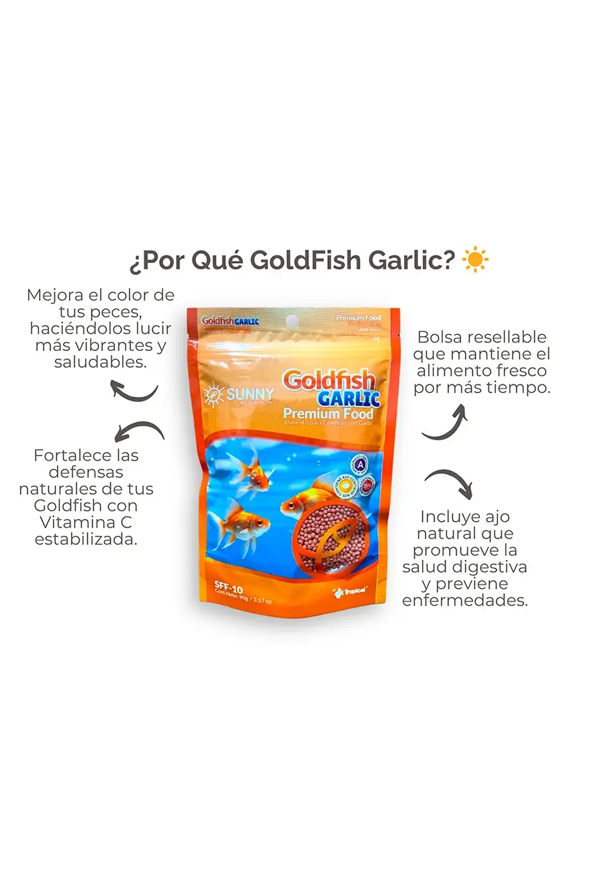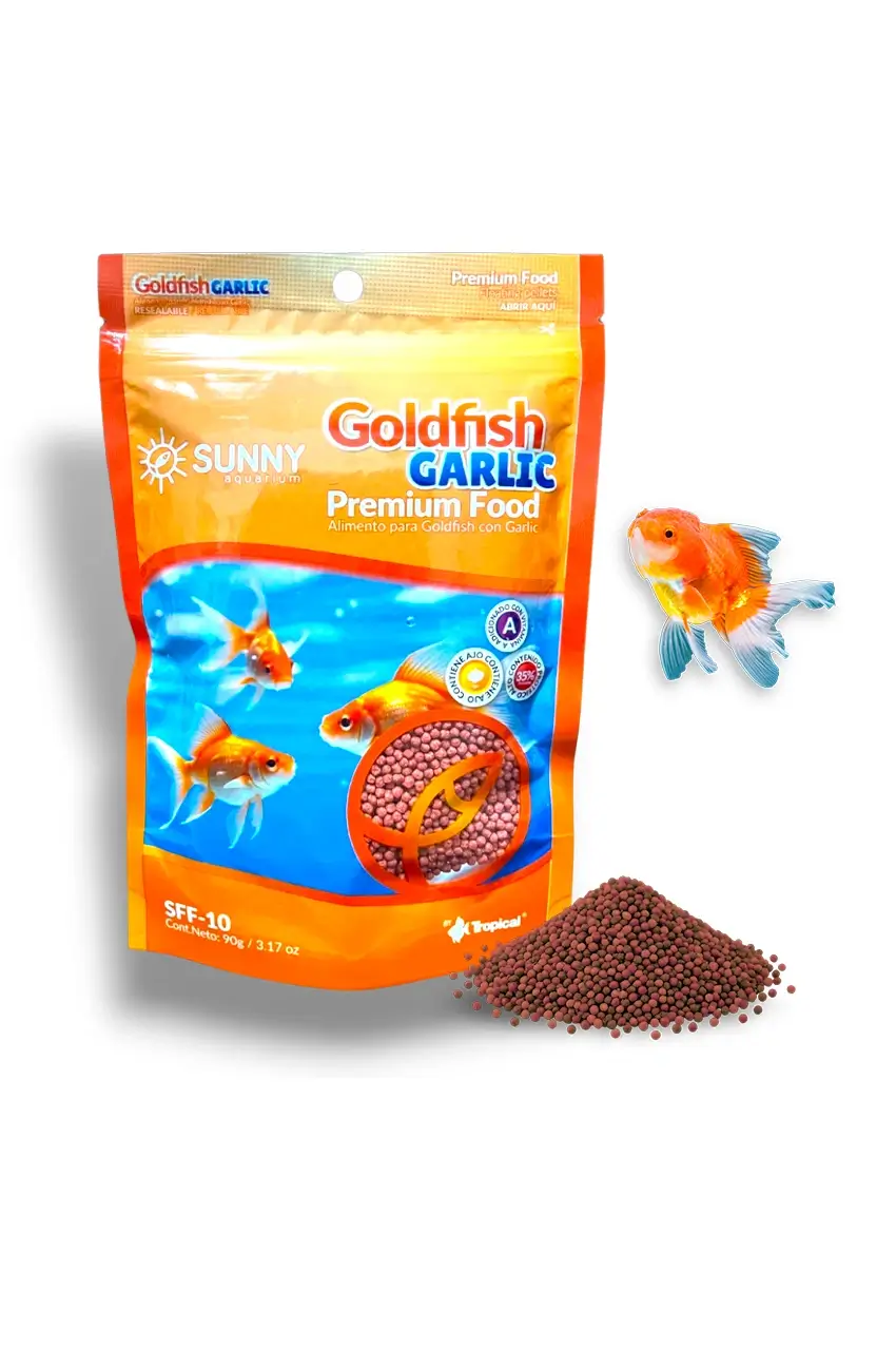 Sunny Goldfish Garlic Premium Food es la elección ideal para quienes desean cuidar y alimentar a sus peces Goldfish con la mejor calidad. Su fórmula premium está especialmente diseñada para ser altamente digestible, nutritiva y deliciosa, promoviendo el bienestar integral de tus peces día tras día.