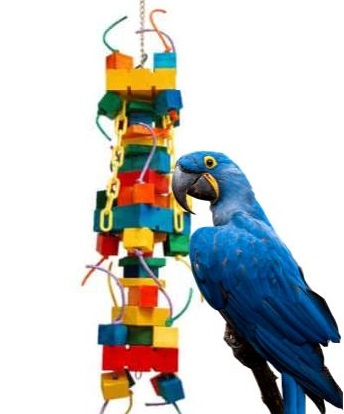 Este colorido juguete para loros grandes permite esconder sus premios favoritos en los bloques acanalados para que forrajee.
