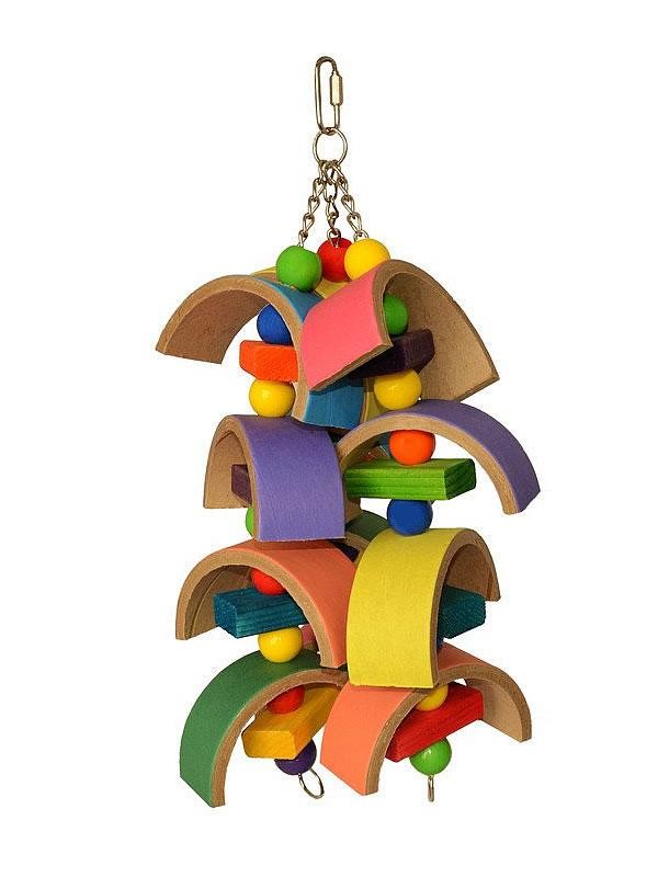 12 mitades de aro de cartón gigante son la base principal de este entretenido y colorido juguete. Contiene además viarios bloques de madera y multitud de bolas de plástico que mantendrán entretenido a cualquier loro de mediano y gran tamaño.