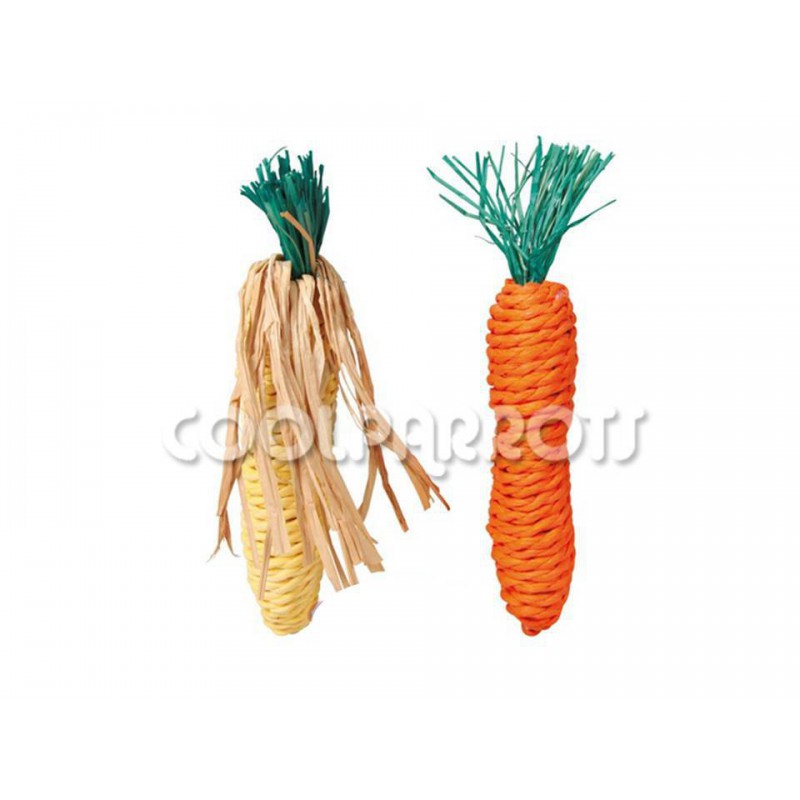 Pack de dos juguetes de cuerda y paja con forma de zanahoria y mazorca de 15 cm de longitud.