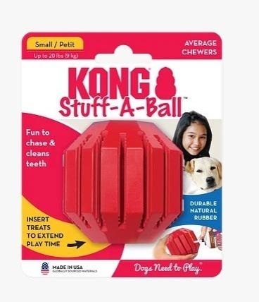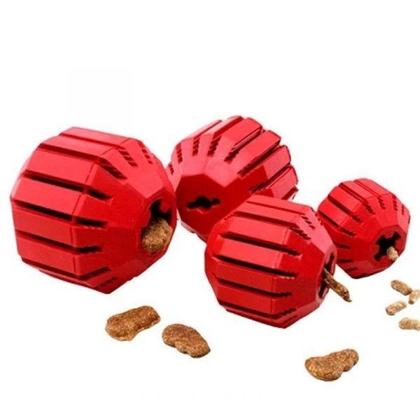 - Pelota Classic Red Rubber Ball con Denta-Ridges™ que puede rellenarse con alimento, pasta o mantequilla de maní para prolongar las sesiones de juego.