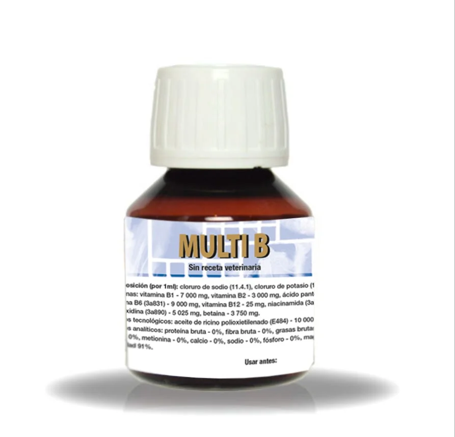 es una fórmula altamente concentrada que contiene un complejo de vitaminas del complejo B que mejora el metabolismo y reduce riesgo de E-Cunicoli. La vitamina B12 tiene un impacto positivo en el funcionamiento del sistema nervioso y en el estado general de salud de animal. DOSIFICACION 1 ml por 1 litro de agua 1-2 veces por semana.
