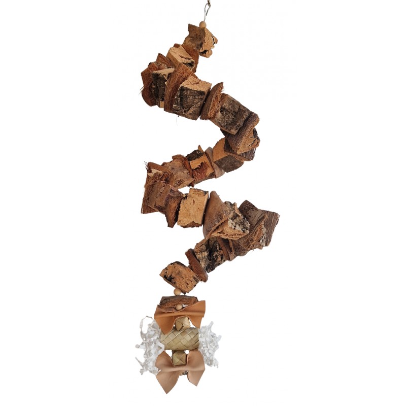 Si unimos un divertido balancín en forma de espiral, con multitud de piezas 100% naturales, logramos el juguete ideal para mantener entretenidas a nuestras aves de tamaño pequeño y mediano.