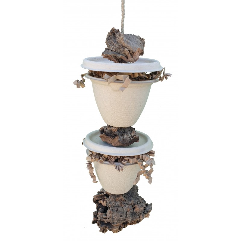 Cualquier loro adora desmenuzar piezas de corcho natural. Este entretenido juguete está compuesto por 3 piezas de corcho y 2 recipientes rellenos de pequeñas tiras de papel entre las que podemos esconder sus premios favoritos, bolitas de pienso…, así imitamos comportamientos que tendrían en libertad, ya que pasan largos ratos buscando su alimento entre hojas, ramas, etc.