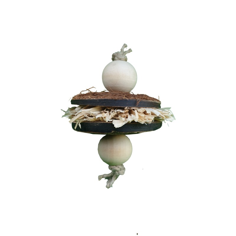 Juguete de pata 100% natural compuesto por dos piezas de coco que van unidas por un cordón de cáñamo y 2 bolas de madera y esconden en su interior un pompón de rafia.