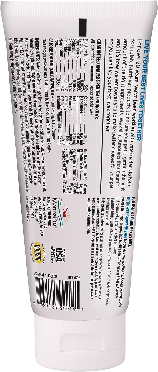 Nutri-Vet Puppy-Vite Gel proporciona vitaminas, minerales, antioxidantes y otros nutrientes esenciales para optimizar la salud a medida que los cachorros crecen. Este gel vitamínico para cachorros con sabor a hígado se puede aplicar fácilmente en la pata o en la comida de un cachorro. Formulado veterinario para cachorros de hasta nueve meses.