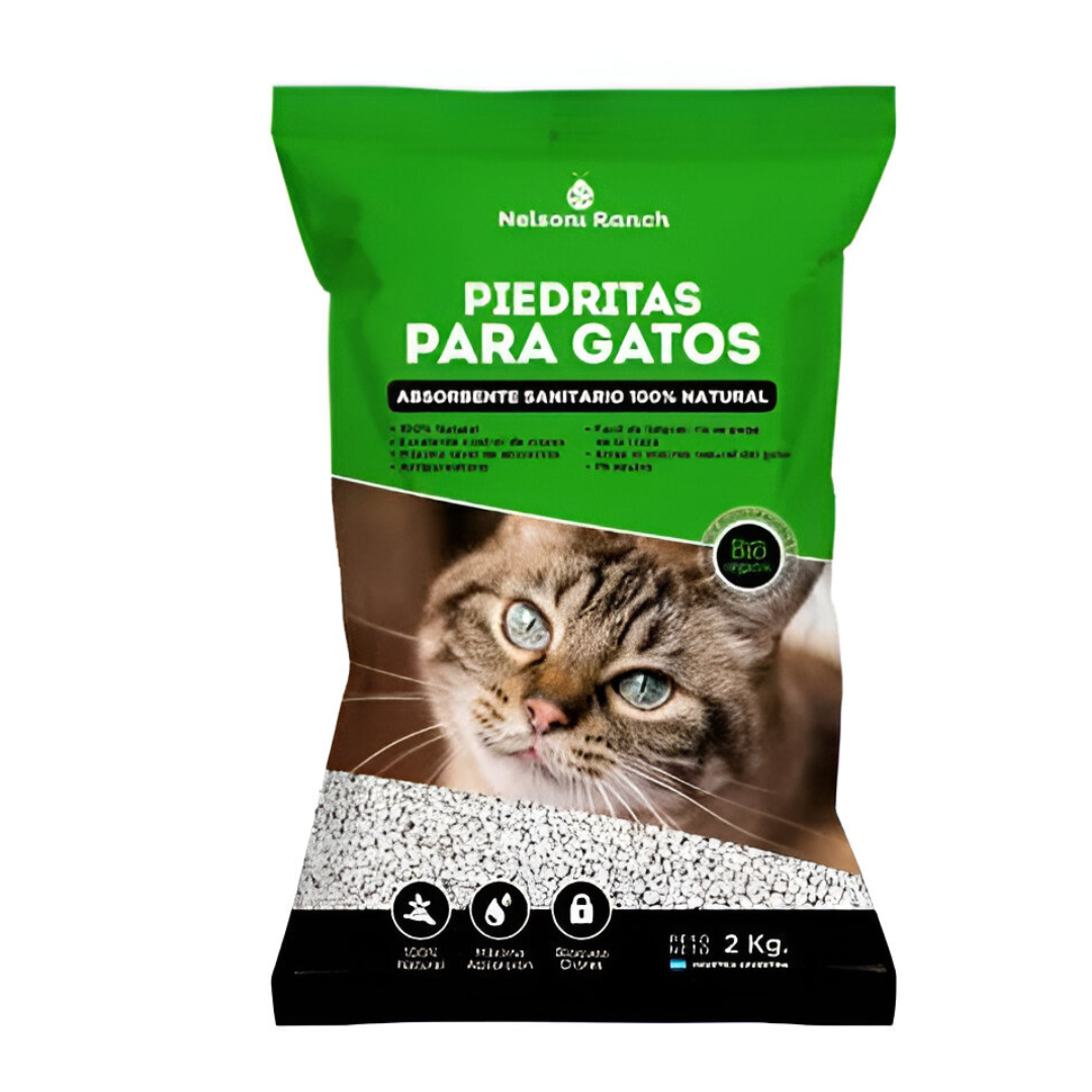 Piedra blanca para gatos Nelsoni Ranch, conocida por su capacidad de absorción. Se presenta en fundas de 5 paquetes, cada uno con 2 kg de producto. Ideal para mantener el área de tu gato limpia y libre de malos olores.