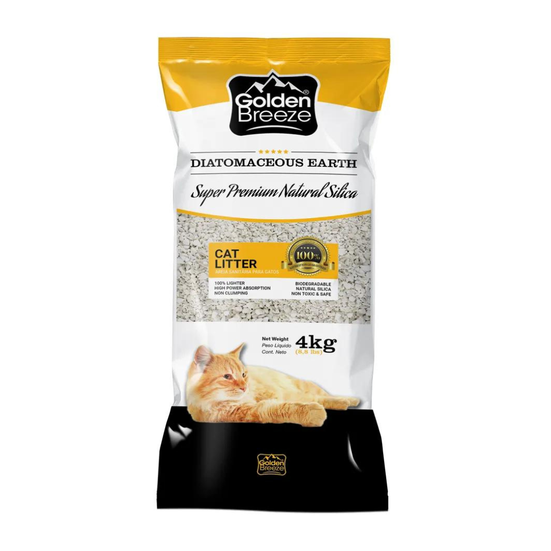 Piedra sanitaria Golden Breeze diatomita super absorbente, atóxica, ecológica y biodegradable. Presentación en funda de 4 paquetes de 4 kg .
