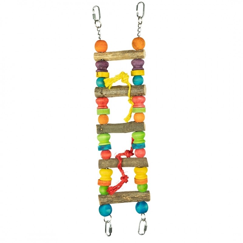 Atractivo puente compuesto por diversas piezas de madera de llamativos colores y distintas formas que puede colocarse en cualquier jaula o voladera tanto a modo de puente, ya que lleva mosquetones en sus 4 extremos, como a modo de escalera.