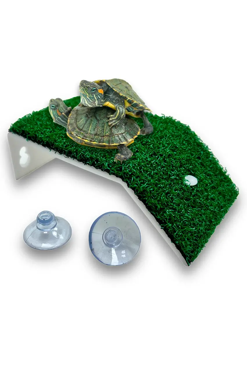 La Rampa Isla para Tortugas ofrece un espacio seguro y cómodo donde tus tortugas pueden salir del agua para descansar y regular su temperatura corporal. Este accesorio está fabricado con materiales duraderos y no tóxicos, asegurando que sea seguro para tus mascotas y resistente para un uso prolongado. La superficie de césped sintético antideslizante proporciona un agarre seguro, evitando resbalones y caídas, mientras que las ventosas de alta calidad garantizan una fijación estable en acuarios o estanques.