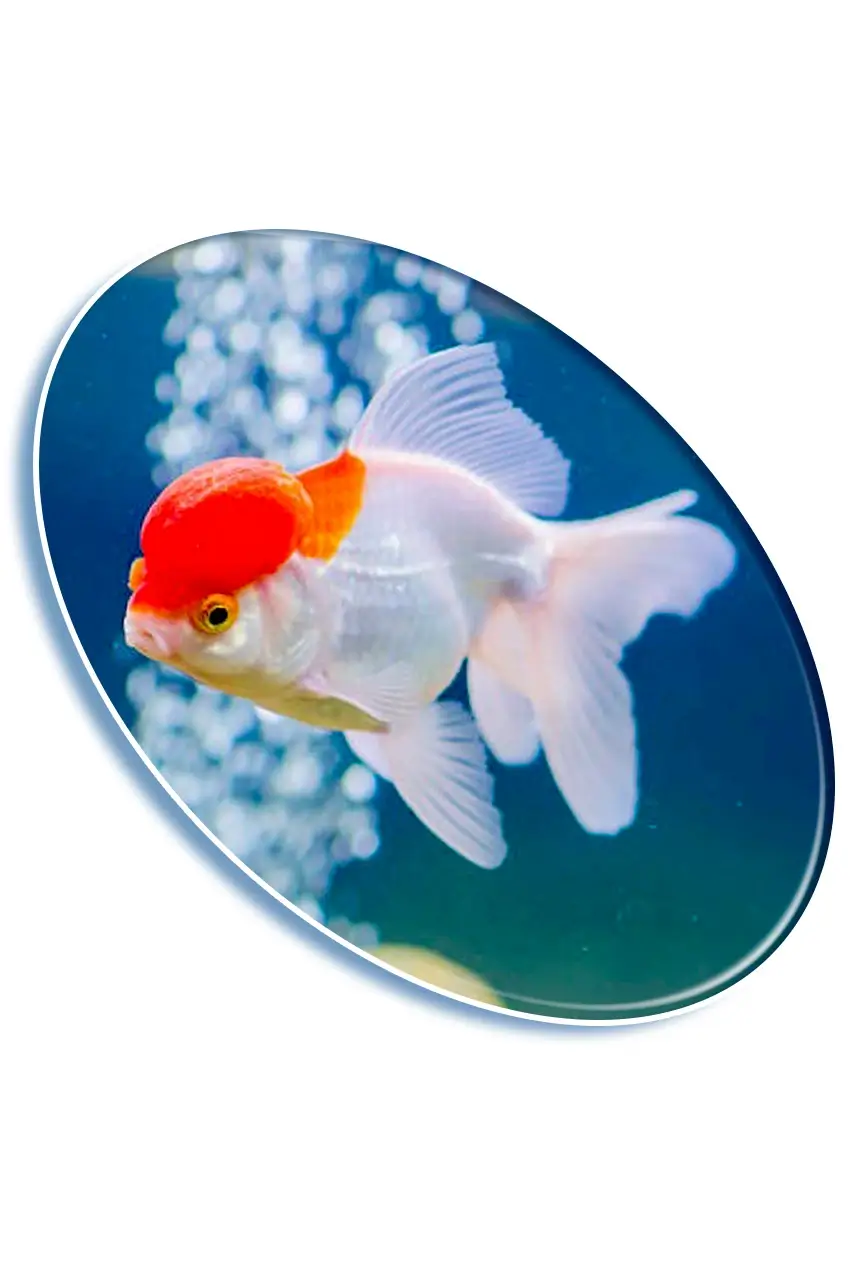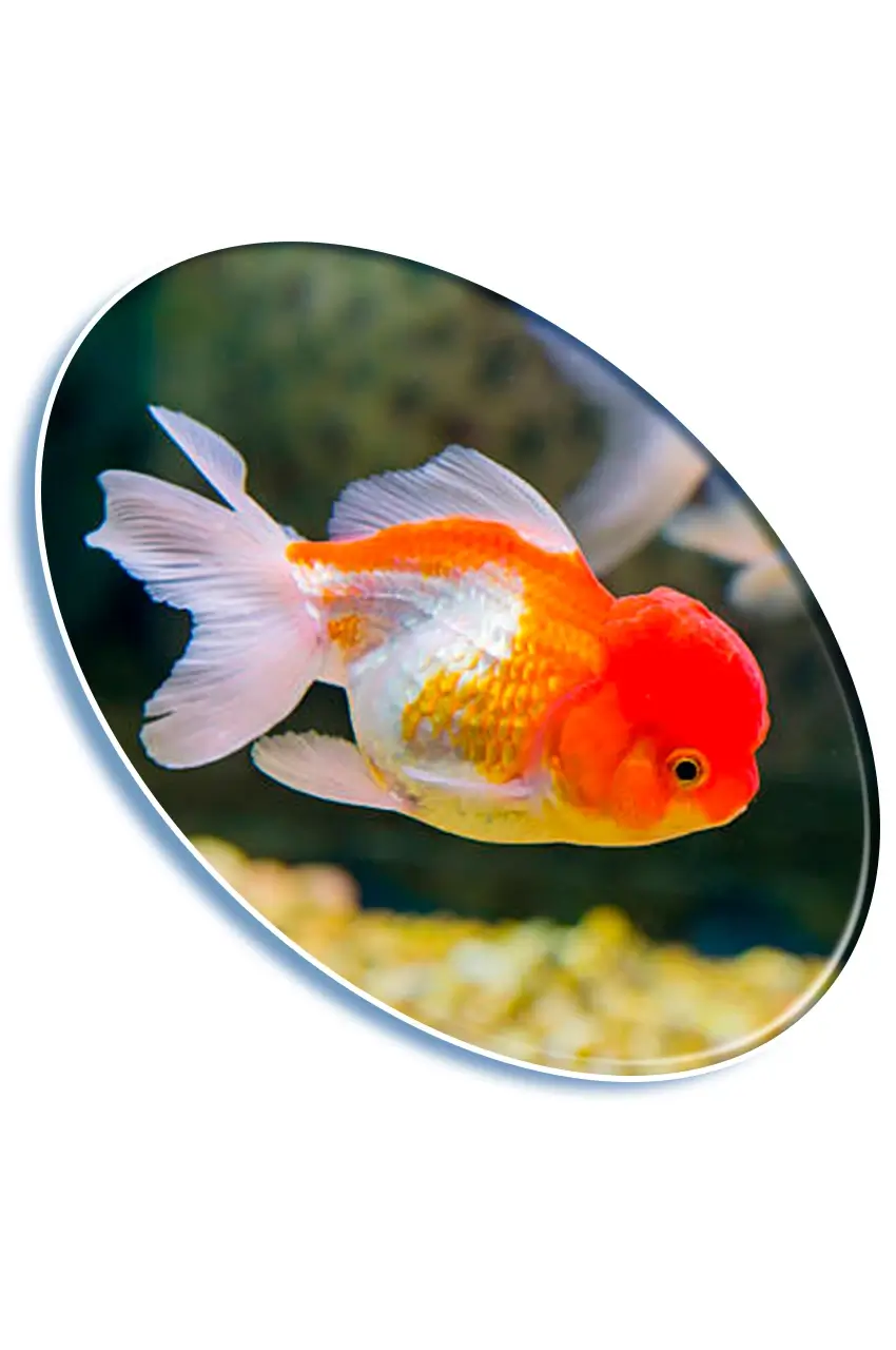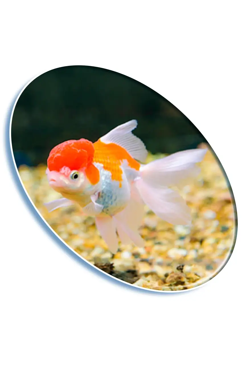 Pez de agua dulce ornamental con su icónica capucha roja. Ideal para acuarios decorativos y amantes de los goldfish.