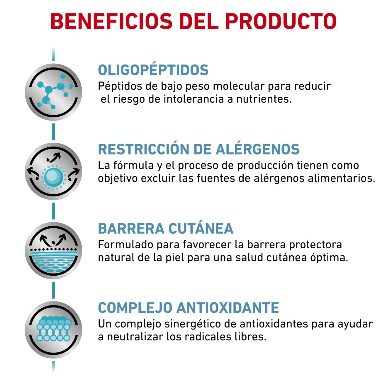 ROYAL CANIN® Anallergenic está formulado específicamente para ayudar a perros adultos con intolerancias y alergias alimentarias. Esta dieta está formulada con una proteína en forma de péptidos muy pequeños y aminoácidos puros para minimizar el reconocimiento inmunitario y, por tanto, minimizar el riesgo de reacción adversa al alimento. Esta fórmula se elabora específicamente para minimizar la contaminación y excluir las fuentes de alérgenos alimentarios. Gracias a su combinación de nutrientes de apoyo, esta fórmula favorece la barrena protectora natural de la piel de tu perro. Esta fórmula está enriquecida con una combinación sinérgica de antioxidantes para ayudar a neutralizar los efectos de los radicales libres. Como parte de la gama ROYAL CANIN® Veterinary Health Nutrition, solo debes dar este producto a tu mascota si te lo recomienda un veterinario . La transición de tu mascota de una dieta a otra debe realizarse de forma lenta y gradual durante un período de 7 a 10 días