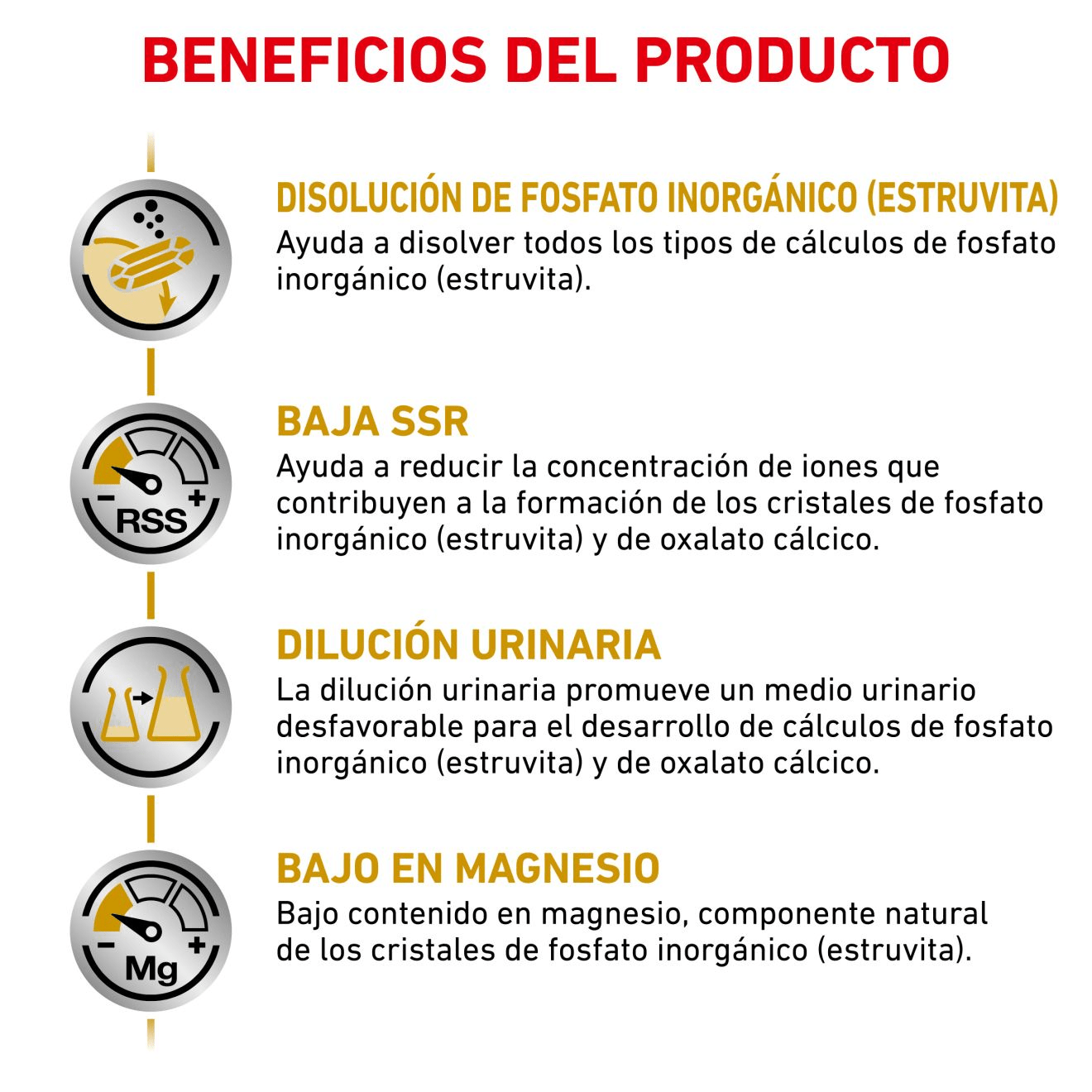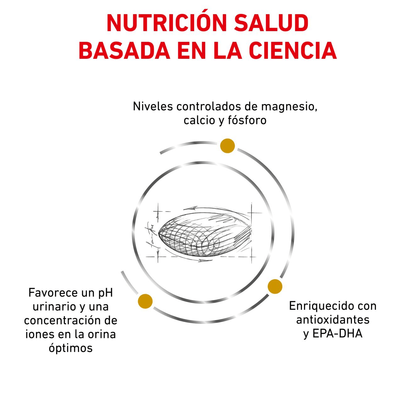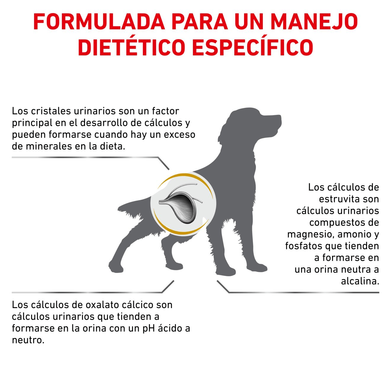 ROYAL CANIN® Urinary S/O está formulado específicamente para ayudar a perros con sensibilidades urinarias como los cálculos y cristales de estruvita. Esta fórmula ayuda a disolver cualquier tipo de cálculo de estruvita que pueda formarse en la vejiga. Esta fórmula contiene una baja SSR (sobresaturación relativa) para ayudar a reducir la concentración de iones que contribuyen a la formación de cristales. Esta dieta ayuda a diluir la orina de tu perro, haciendo menos probable la formación de cálculos de estruvita o de oxalato de calcio. Esta fórmula contiene un nivel reducido de magnesio, un componente natural de los cristales de estruvita. ROYAL CANIN® Urinary S/O también contribuye a un entorno urinario desfavorable para el desarrollo de cálculos de estruvita y oxalato de calcio. Como parte de la gama ROYAL CANIN® Veterinary Health Nutrition, solo debes dar este producto a tu mascota si te lo recomienda un veterinario . La transición de tu mascota de una dieta a otra debe realizarse de forma lenta y gradual durante un período de 7 a 10 días. Debes asegurarte de ofrecer las raciones correctas, particularmente si la alimentación es mixta. Para satisfacer las preferencias individuales de cada perro, ROYAL CANIN® Urinary S/O también está disponible en forma alimento húmedo en láminas finas en salsa o en forma de textura similar a la de paté*. * Sujeto a la disponibilidad del producto