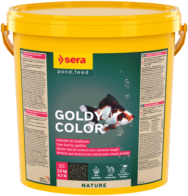 Alimento que potencia los colores para carpas doradas con un 10% de espirulina, sera Goldy Color Spirulina Nature es el alimento que potencia los colores en forma de granulado elaborado manteniendo todas sus propiedades, sin colorantes ni conservantes, para carpas doradas grandes, formas híbridas exigentes y otros peces de agua fría de gustos complicados. Durante todo el año administrar 1 a 2 veces al día en raciones pequeñas que los animales puedan consumir en poco tiempo.