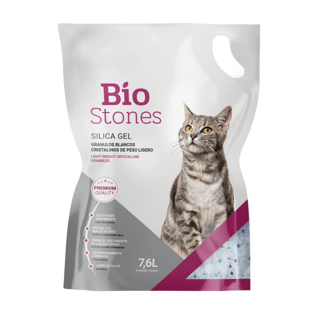 La sílica gel Bio Stones es un producto innovador con gránulos blancos ligeros que frenan el crecimiento de bacterias y absorben eficientemente la orina. Compuesta por dióxido de silicio no tóxico, ofrece un excelente control de olores, es libre de polvo, fácil de limpiar y extremadamente duradera. Presentado en caja con 4 paquetes de 7.6lts cada uno.