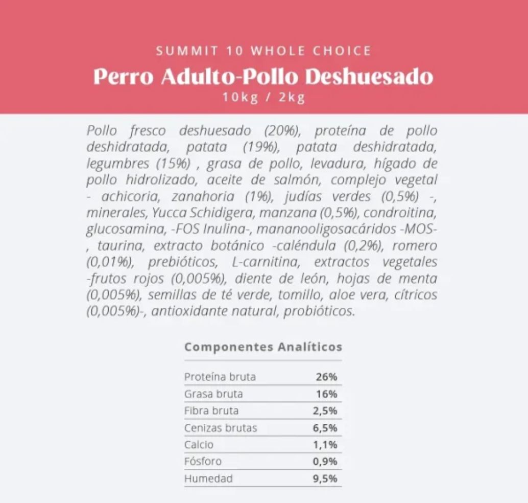 Pollo fresco deshuesado (20%), proteína de pollo deshidratada, patata (19%), legumbres (15%), grasa de ave, levadura, hígado de pollo hidrolizado, aceite de salmón, complejo vegetal – achicoria, zanahoria (1%), judías verdes (0,5%) -, minerales, Yucca schidigera, manzana (0,5%), sulfato de condroitina, glucosamina, prebióticos: fructooligosacáridos -FOS-, mananooligosacáridos -MOS-, plantas herbales -caléndula (0,2%), romero (0,01%)-, extractos de plantas – frutos rojos (0,005%), diente de león, hojas de menta piperita (0,005%), semillas de té verde, tomillo, Aloe vera, cítricos (0,005%).