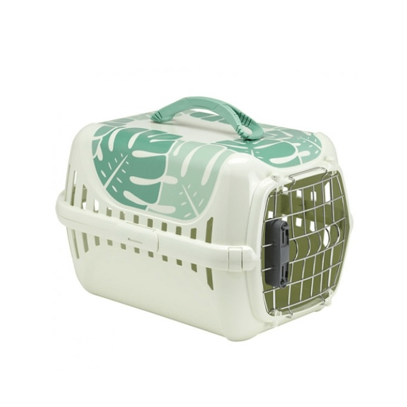 Transportadora de plástico resistente con puerta de metal para animales pequeños.