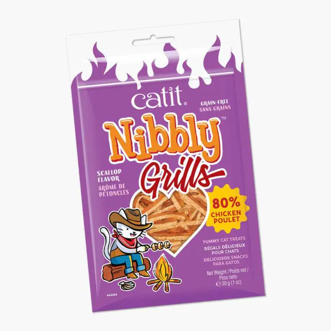 Ingredientes: pollo, glicerina vegetal, aislado de proteína de soja, sabor natural, sorbitol, vieiras, dióxido de titanio (color), sorbato de potasio (conservante).