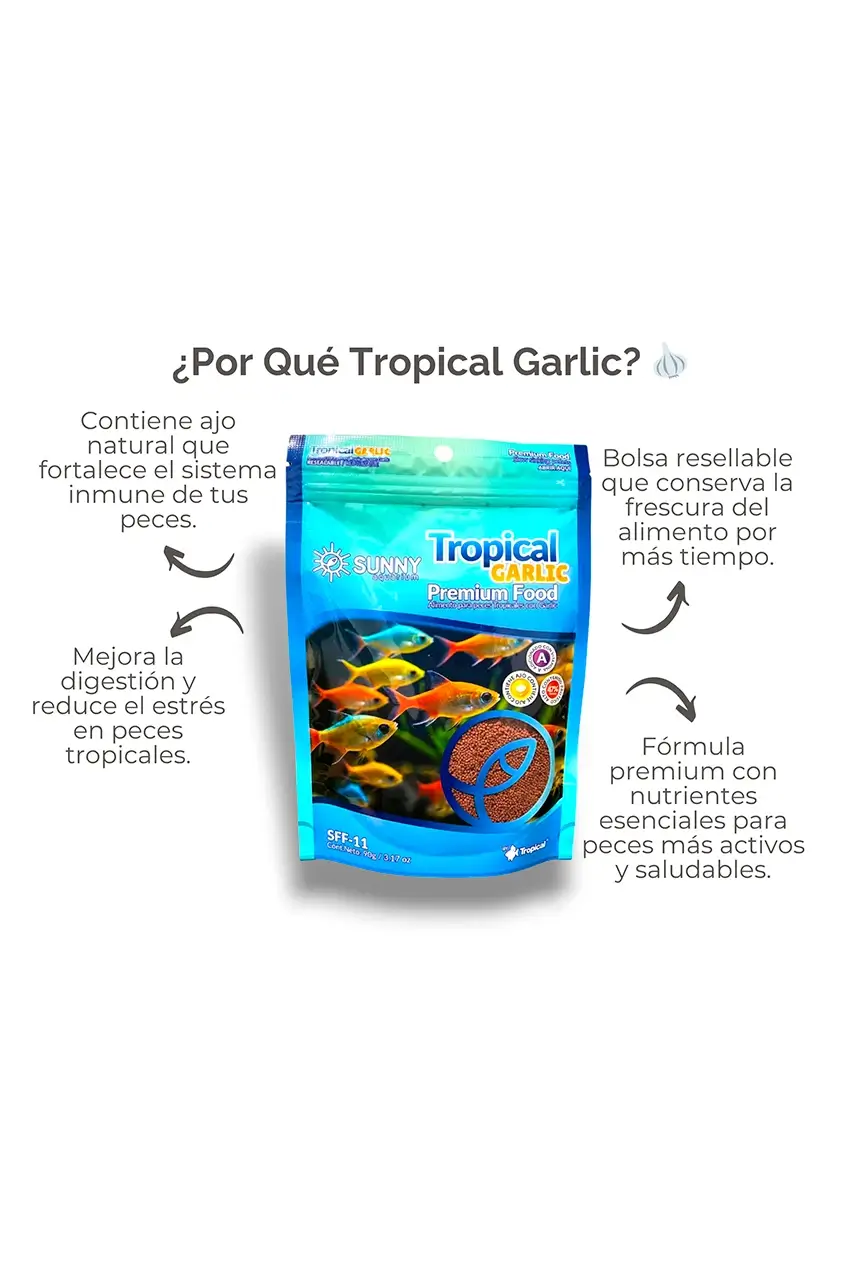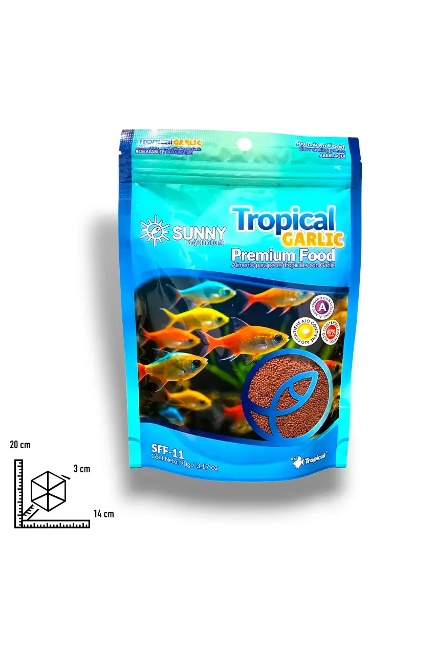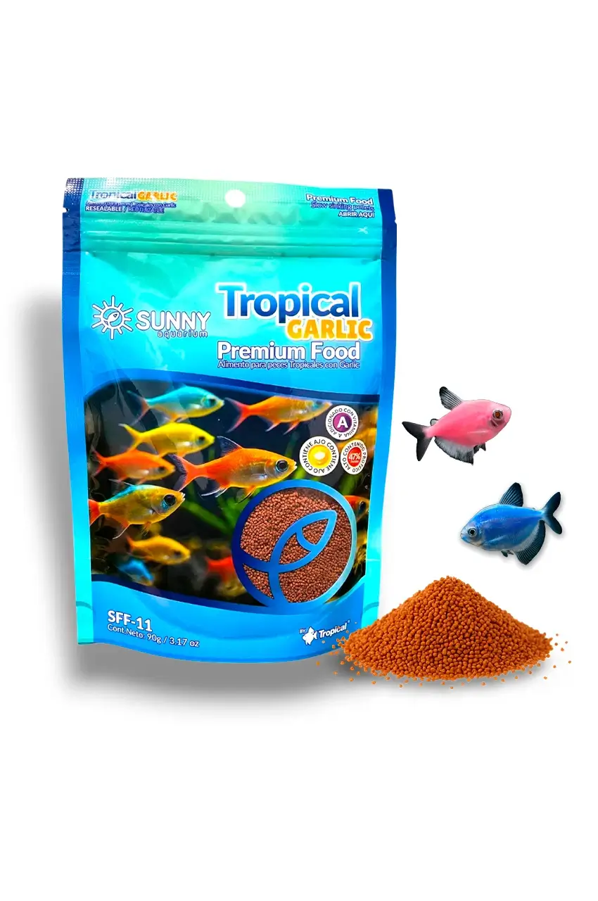 Tropical Garlic Premium Food de Sunny Aquarium es un alimento granulado de alta calidad, enriquecido con ajo natural y vitamina C estabilizada. Este alimento no solo nutre, sino que protege a tus peces tropicales fortaleciendo su sistema inmunológico y favoreciendo una digestión eficiente.