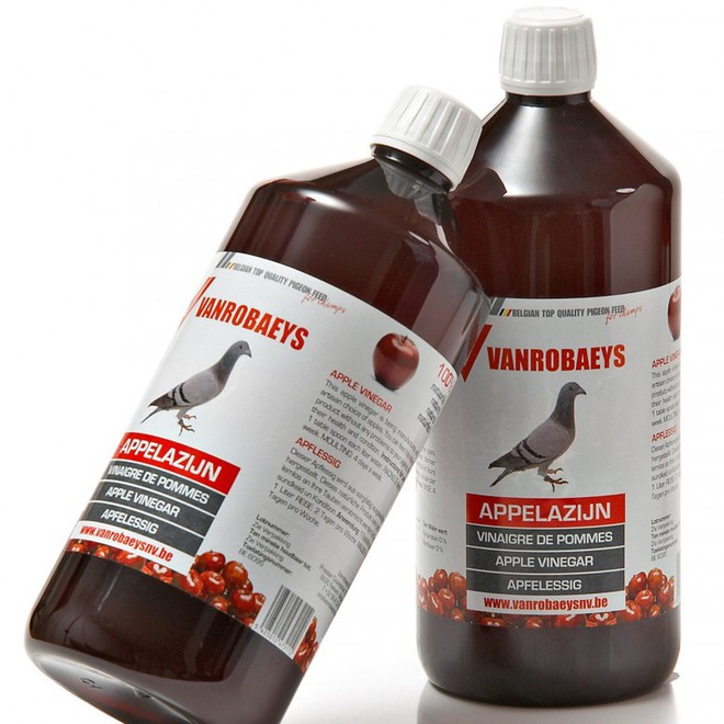 El Vinagre de Manzana palomas Vanrobaeys está fabricado con una selección de manzanas de forma artesanal. Puede proporcionar este producto natural sin ningún problema a sus palomas, en beneficio de su salud y condiciones. El vinagre de manzana palomas tiene efectos diuréticos, ya que es rico en Potasio y ayuda a alcalinizar el PH de las palomas, provocando en su organismo un efecto depurativo y remineralizante.